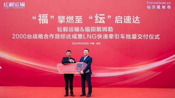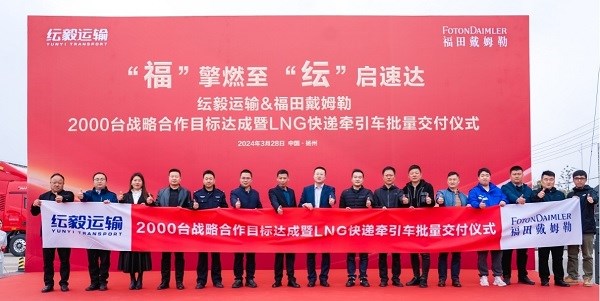 2024年3月28日,以“褔擎燃至 纭启速达”为主题的纭毅运输&福田戴姆勒2000台战略合作目标达成暨LNG牵引车批量交付仪式在江苏扬州圆满举行。宝应县政府、北京福田戴姆勒汽车有限公司、纭毅纭庆(扬州)运输有限公司、优秀驾驶员以及客户代表共同出席了本次交车活动。